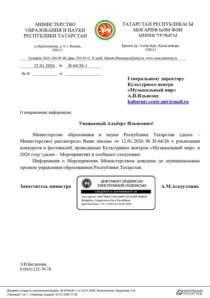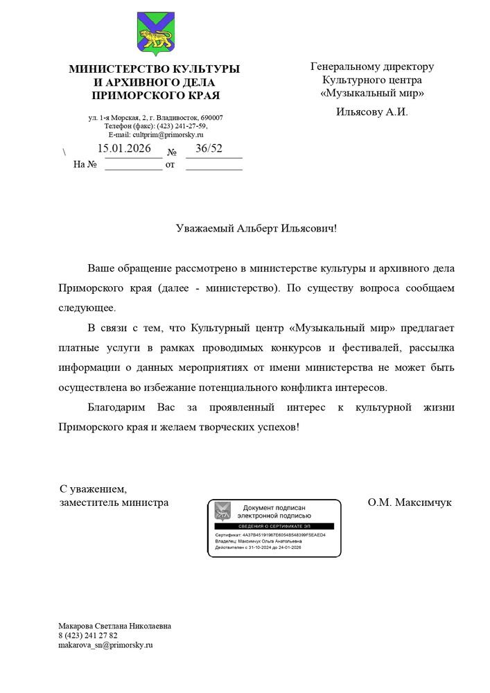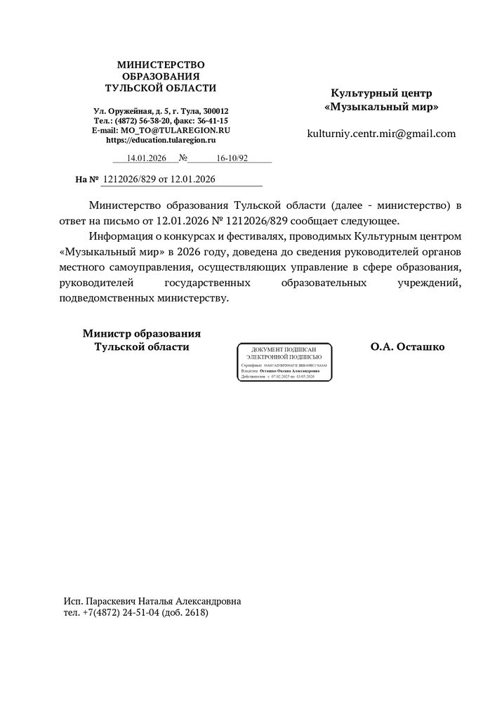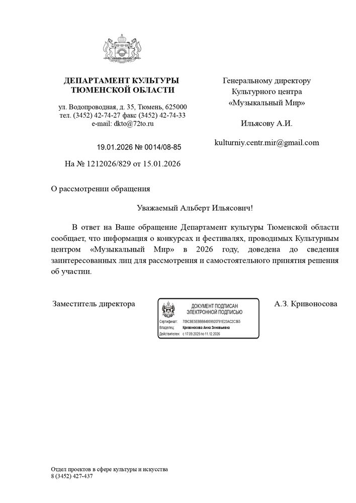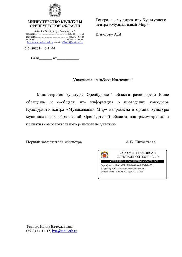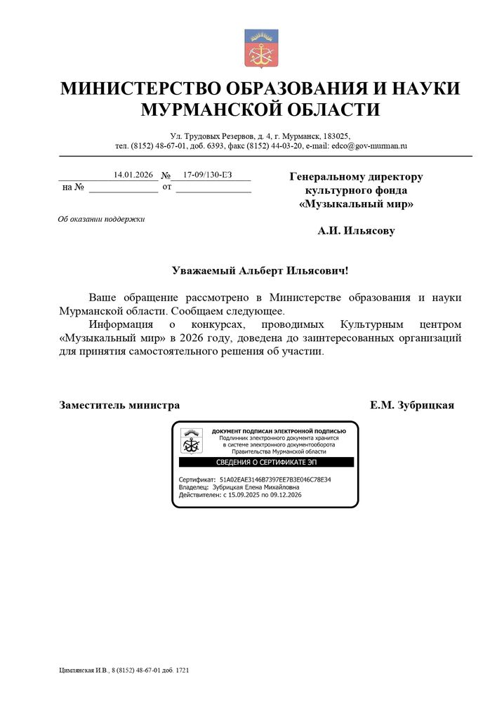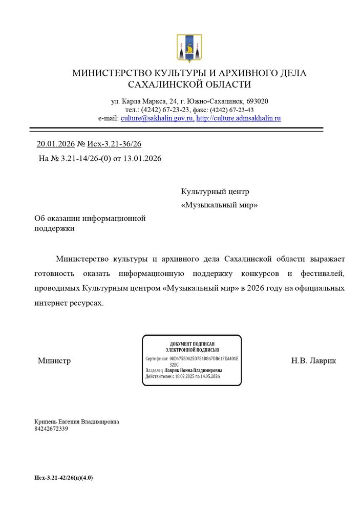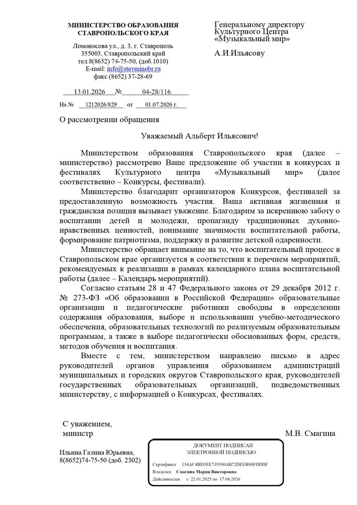 Письма информационной поддержки министерства образования и культуры субъектов Российской Федерации в проведении международных и всероссийских многожанровых конкурсов и фестивалей Культурным центром "Музыкальный Мир".